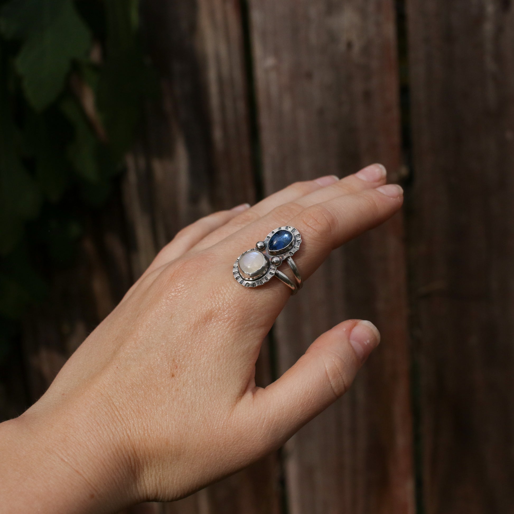 Handcrafted in sterling silver, this one-of-a-kind piece pairs two stones that feel like opposites finally meeting in harmony. A glowing moonstone offers its soft, ethereal sheen—an echo of intuition, dreams, and the quiet wisdom that rises when you slow down. Beside it sits a deep blue kyanite, known for its grounding, centering energy, like the calm you find beneath a wide-open sky.