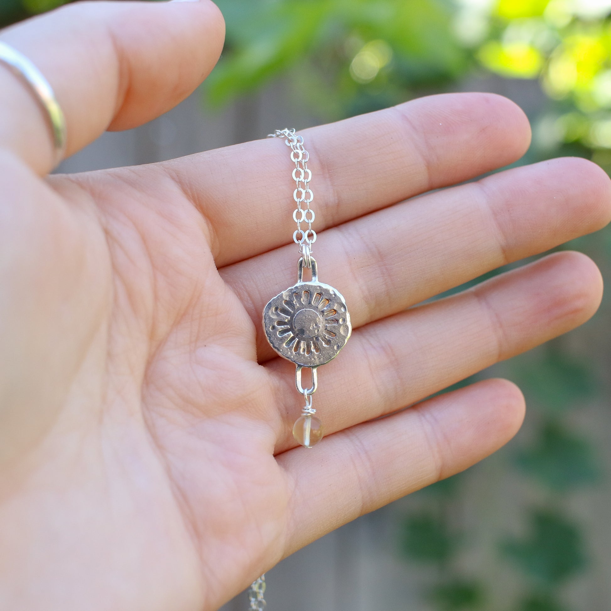 Suspended from a 22-inch chain, the pendant is complemented by a lemon quartz stone, known for its uplifting energy and association with optimism and clarity. Together, they serve as a gentle reminder to embrace the light within and navigate life's journey with warmth and resilience.